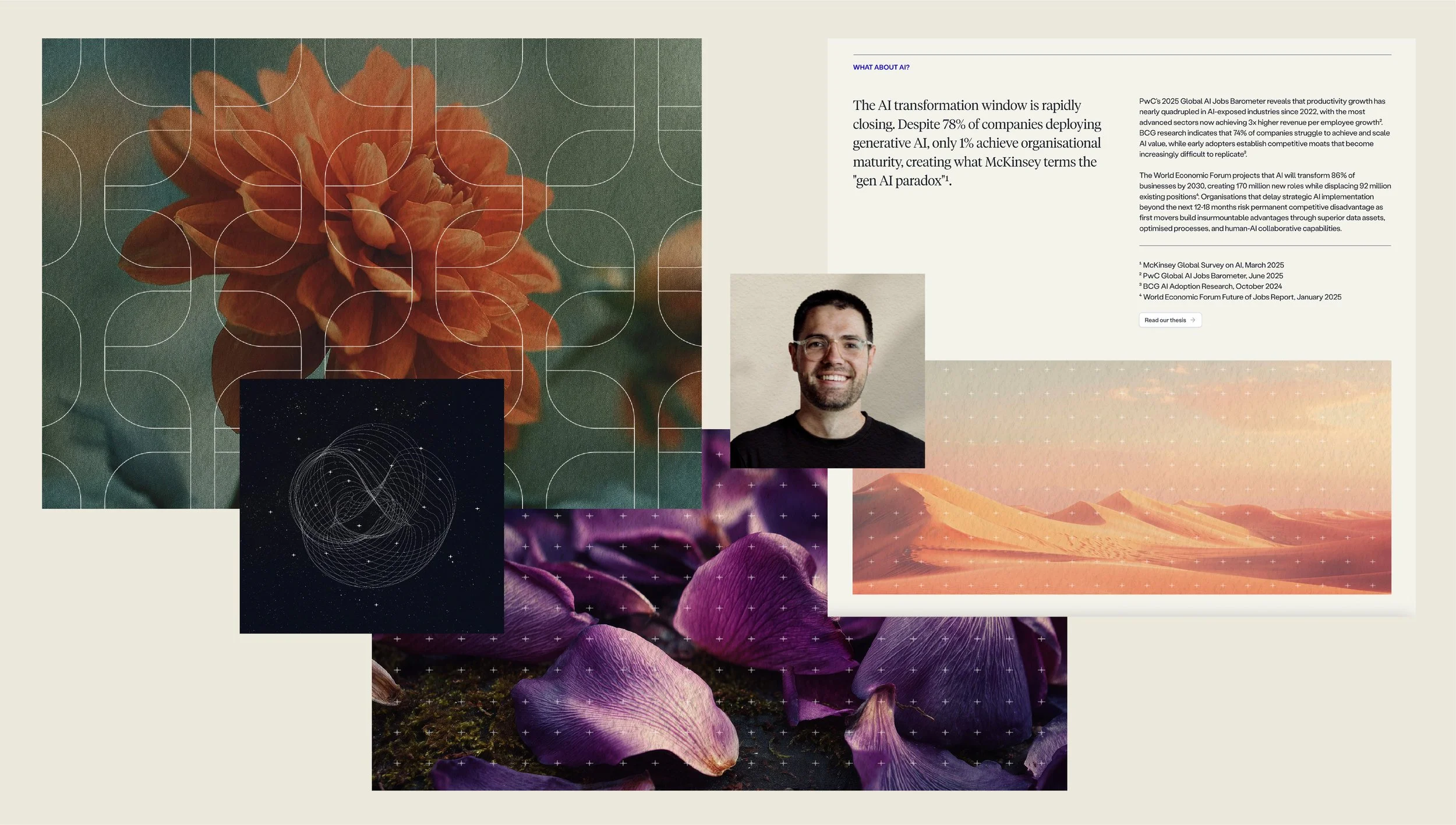 Using Midjourney in combination with photo editing, technology is blended with ethereal nature imagery and painterly, paper-like textures. Expressing transformation, resilience and efficiency. The muted colours further connect the AI generated images to the organic theme.